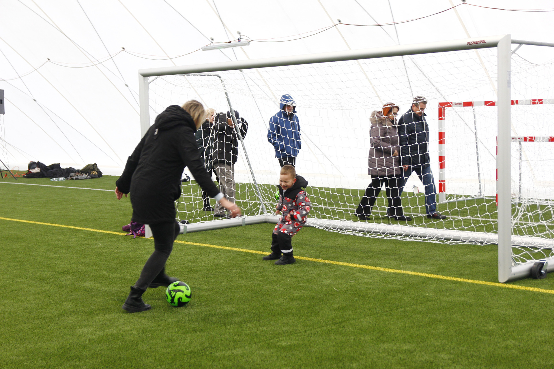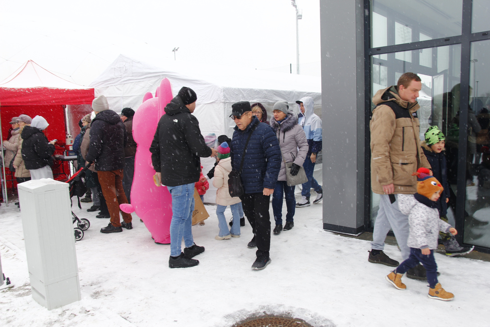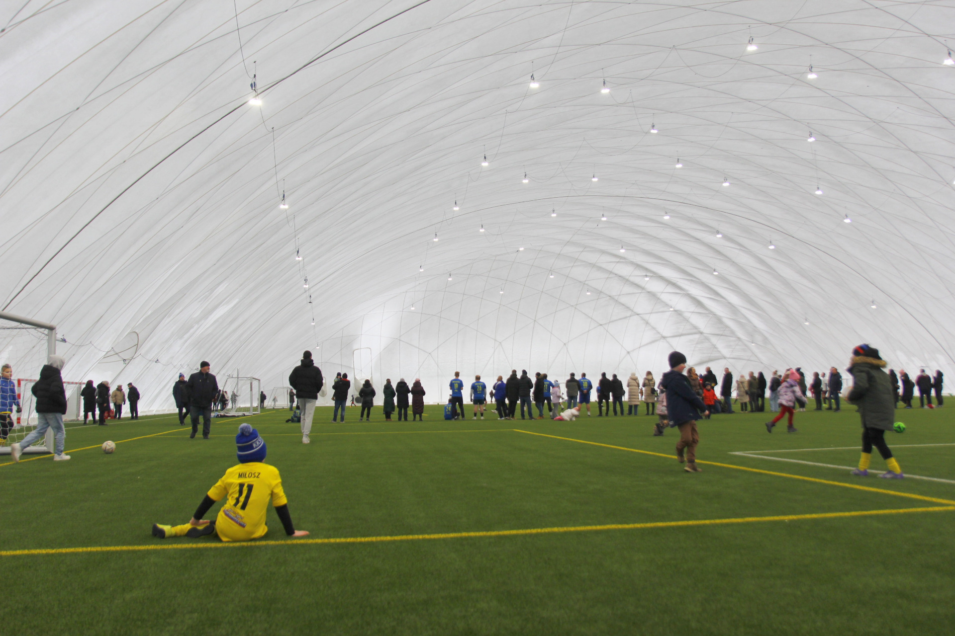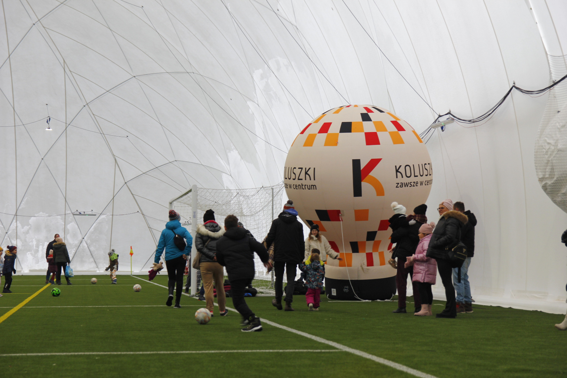 Co prawda zimowa aura zachęcała bardziej do urządzenia kuligu niż pikniku, ale w minioną niedzielę z pewnością dobrej zabawy nie brakowało na nowo otwartym stadionie przy ul. Zagajnikowej w Koluszkach. Mieszkańcy, którzy przyszli zapoznać się z obiektem częstowani byli grochówką i daniami z grilla. Do ogrzania się udostępniony został także nowy budynek klubowy. Ze względu na niskie temperatury cała zabawa przeniosła się pod balon, czyli do olbrzymiej hali pneumatycznej, która powstała poprzez przykrycie na czas zimowy boiska ze sztuczną nawierzchnią. Tam, poza możliwością pobawienia się piłką, zorganizowano także mecz pomiędzy reprezentacją Urzędu Miejskiego w Koluszkach a reprezentacją wykonawcy inwestycji. Spotkanie zakończyło się wynikiem 10:1 na korzyść reprezentacji naszej gminy. Wielką radość najmniejszym mieszkańcom naszej gminy przysporzyły także maskotki Sticha i Angel, które rozdawały słodycze i pozowały do zdjęć.
